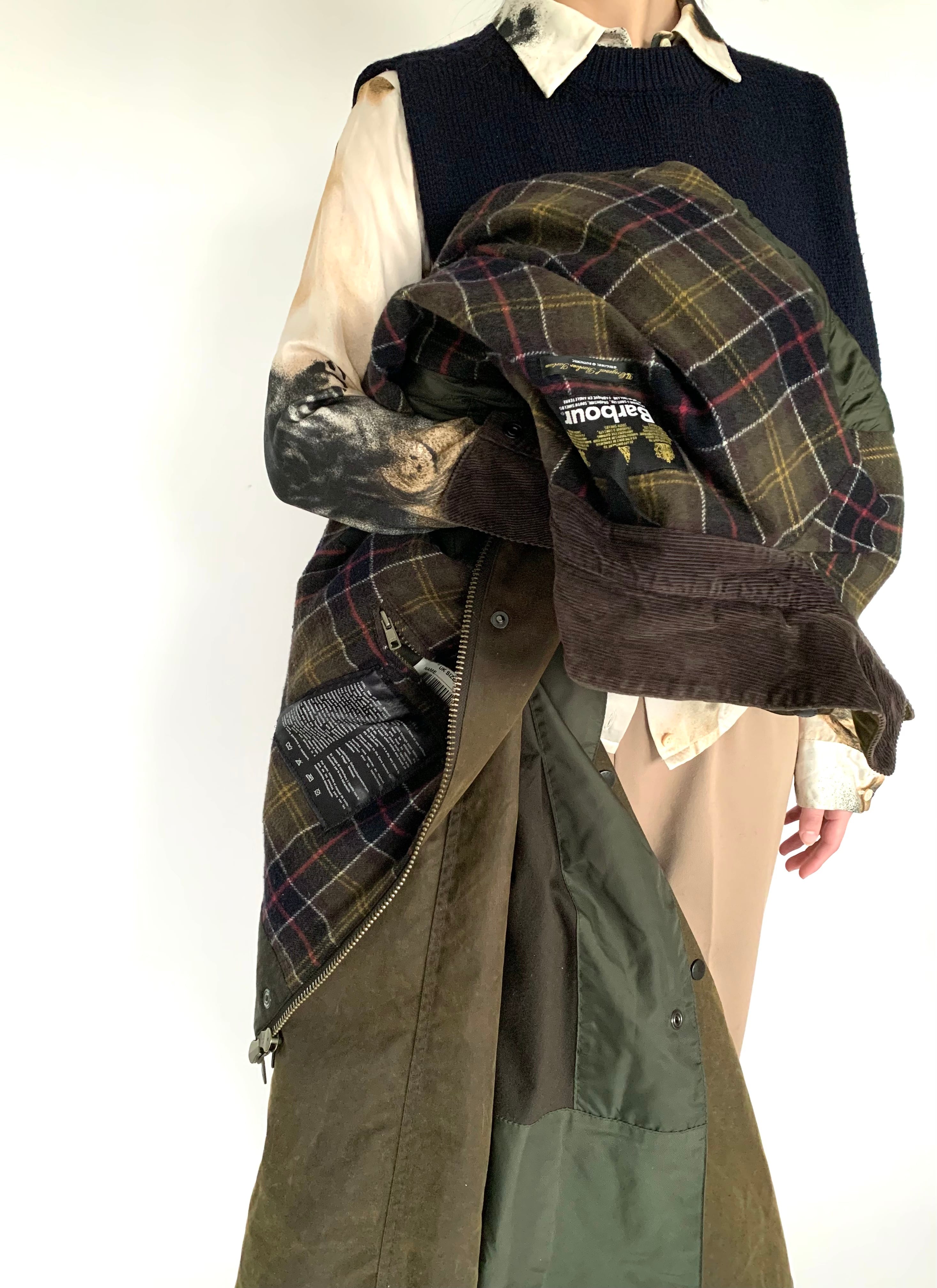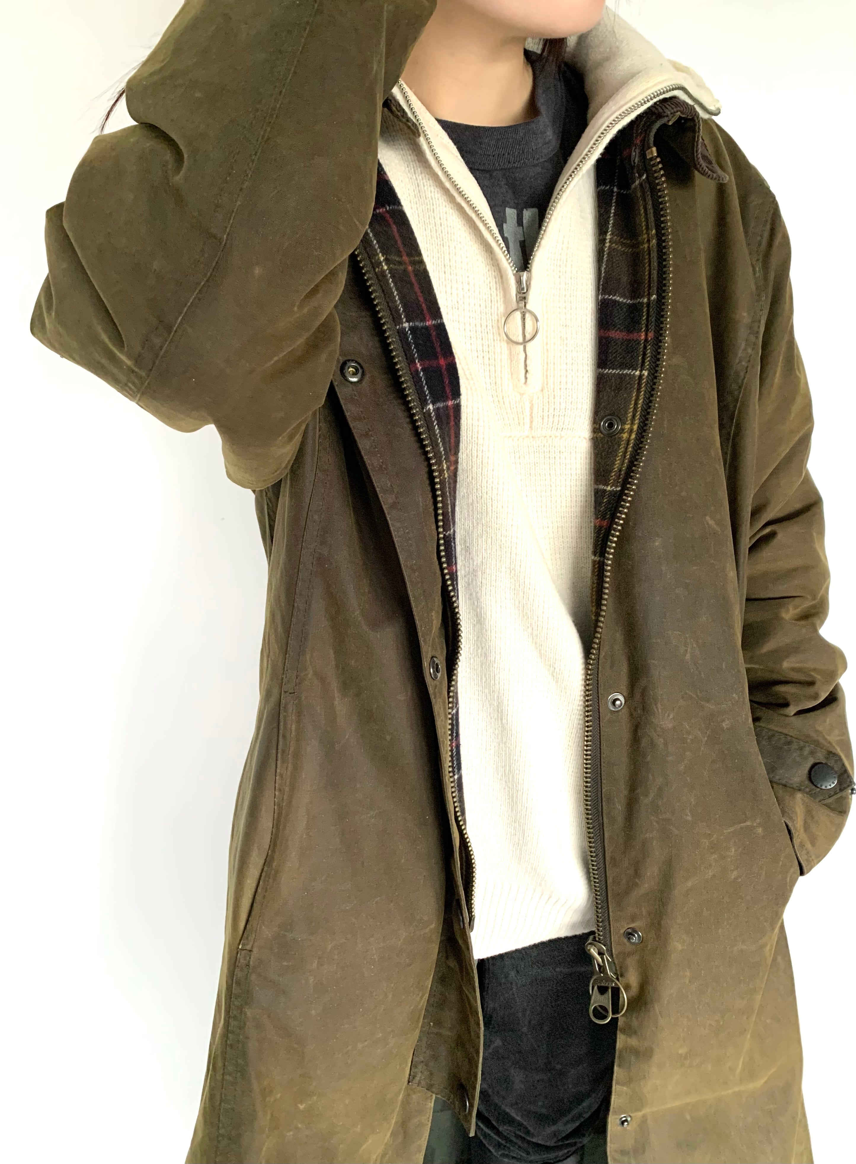 ▲Product detail 静かに雰囲気で着るBarbour 乗馬(競馬)用として生まれた、クラシックなデザインのコート。 着丈の長さとウエストをやや絞ったラインが特徴で、Barbourの中でもどこか品のあるシルエットです。 素材にはブランドを代表するオイルドコットンを使用。 現在はオイルが抜け、重さやベタつきが少し落ち着いた、古着ならではの風合いに変化しています。 デザインはボタンの合わせがレディース仕様ですが、袖丈・着丈ともにしっかりと長さがあり、メンズでも違和感なく着用可能。 ニットやジャケットの上から羽織るようなスタイルにも相性の良い一着です。 袖は中綿入りで、防寒性も確保されています。 秋冬はもちろん、春先まで着用できるバランス。 【Model】 178cm / 63kg Size 18(UK) 着用 ※写真2枚目 163cm Size 18(UK)着用 ※写真3〜4枚目 【素材】表地 オイルドコットン(ワックスドコットン) 裏地 ウール70% / ナイロン25% / コットン5% 袖中綿 ポリエステル100% 【色】カーキ〜ブラウン系 【生産国】イングランド 【状態】※オイルド特有の匂い・ベタつきが多少ございます※部分的に白化がございます ▲Size Size : UK Size18 肩幅 : 47.5cm 身幅 : 62.0cm 袖丈 : 62.5cm 着丈 : 126.5cm 裾囲 : 87.5cm ▲Condition Used.(コンディション等ご理解いただけますよう、お願いいたします。 ▲Caution ※平置き採寸になりますので若干のずれが生じる場合がございます。 ※USED品の為、返品・交換・クレーム等は一切お受けできません。 ※色合いとサイズには若干の個体差がございますので、ご了承くださいませ。
