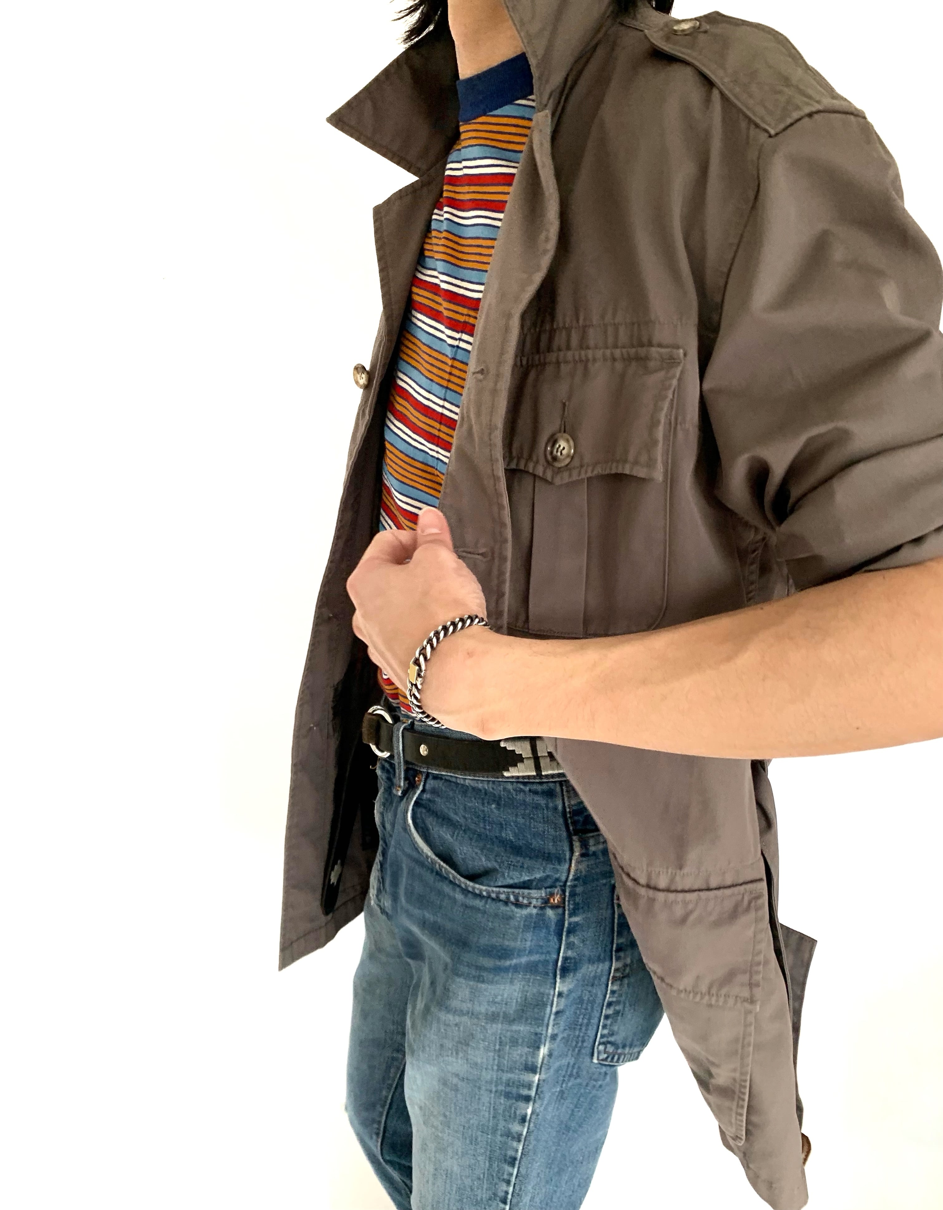 ▲Product detail Willis & Geiger / Bush Jacket(Safari Jacket) Willis & Geigerのブッシュジャケット(サファリジャケット)といえば、ヘミングウェイが着用していたモデルが有名ですが、こちらも王道のディテールを備えた魅力的な1着です。 素材には、ブランドを象徴する“Cotton Bush Poplin”を使用。軽さと耐久性を兼ね備えた生地で、実用性と雰囲気のバランスが非常に優れています。 アウトドア由来のアイテムでありながら野暮ったさはなく、ウエストベルトによるシルエット調整も可能で、すっきりとした印象で着用いただけます。 ドレススタイルの外しとしてはもちろん、カジュアルにも自然に馴染み、幅広いスタイリングに対応可能です。 近年はサファリジャケットやハンティングジャケットといった、いわゆる“スポーツアイテム(貴族の遊び)”や、フォレスティエールのようなクラシックなアイテムが再評価されており、今の気分にも非常に合う一着かと思います。 ※替えボタンなし 【Model】 178cm / 63kg Size M 着用 ※写真19〜20枚目 【色】ベージュ〜ブラウン系 【素材】100%Cotton 【生産国】香港 ▲Size M Size 肩幅 : 53.5cm 身幅 : 57.5cm 着丈 : 79.0cm 袖丈 : 62.0cm ▲Condition Used.(コンディション等ご理解いただけますよう、お願いいたします。) ▲Caution ※平置き採寸になりますので若干のずれが生じる場合がございます ※USED品の為、返品・交換・クレーム等は一切お受けできません ※色合いとサイズには若干の個体差がございますので、ご了承くださいませ