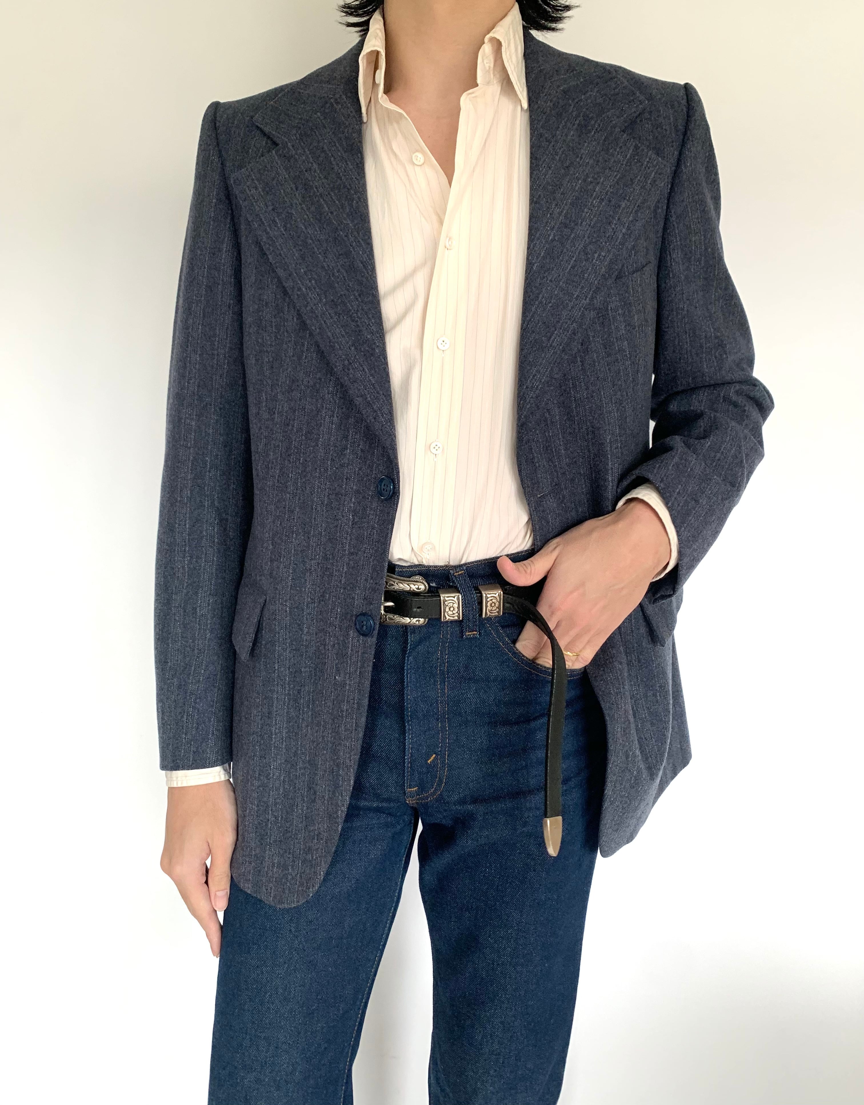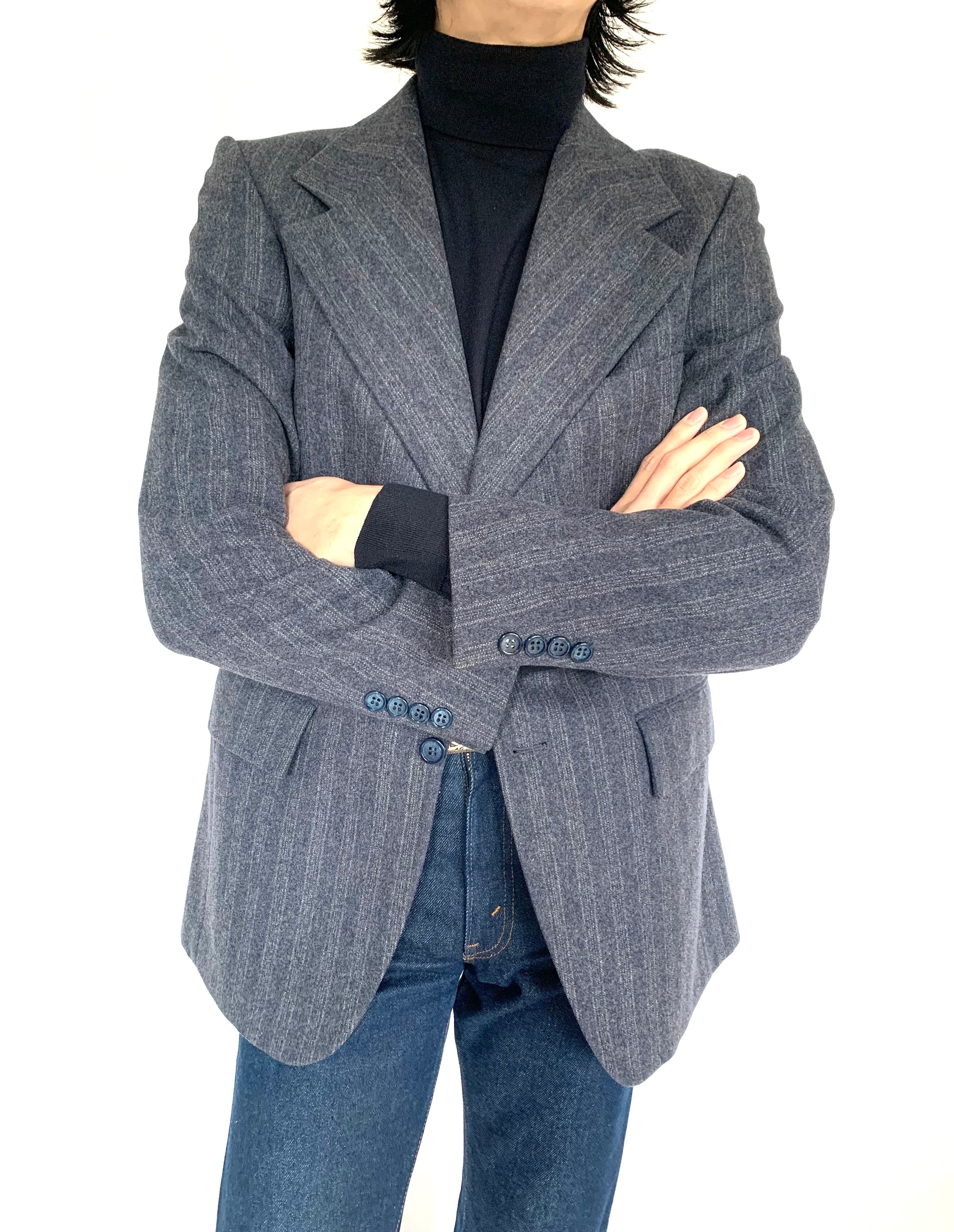 ▲Product detail 太いラペル幅、ゴージ位置の低さ、構築的な肩周りなど70年代、YVES SAINTLAURENTを堪能出来る一着です。 ※ベストも有り 【Model】 178cm / 63kg ※写真11〜17枚目 【色】ネイビー×白ストライプ(太) 【生産国】フランス 【状態】※内側両脇部分、「YVES SAINTLAURENT」タグの近くにシミ汚れ有り ▲Size Size : 記載なし 肩幅 : 44.0cm バスト : 49.5cm ウエスト : 46.5cm 裾囲 : 55.5cm 着丈 : 77.5cm 袖丈 : 63.5cm ※ボタン付けのみの為調整可能です 【Vest】 肩幅 : 30.5cm 身幅 : 44.5cm 着丈(後) : 55.0cm 着丈(前) : 63.5cm ▲Condition Used.(コンディション等ご理解いただけますよう、お願いいたします。 ▲Caution ※平置き採寸になりますので若干のずれが生じる場合がございます。 ※USED品の為、返品・交換・クレーム等は一切お受けできません。 ※色合いとサイズには若干の個体差がございますので、ご了承くださいませ。