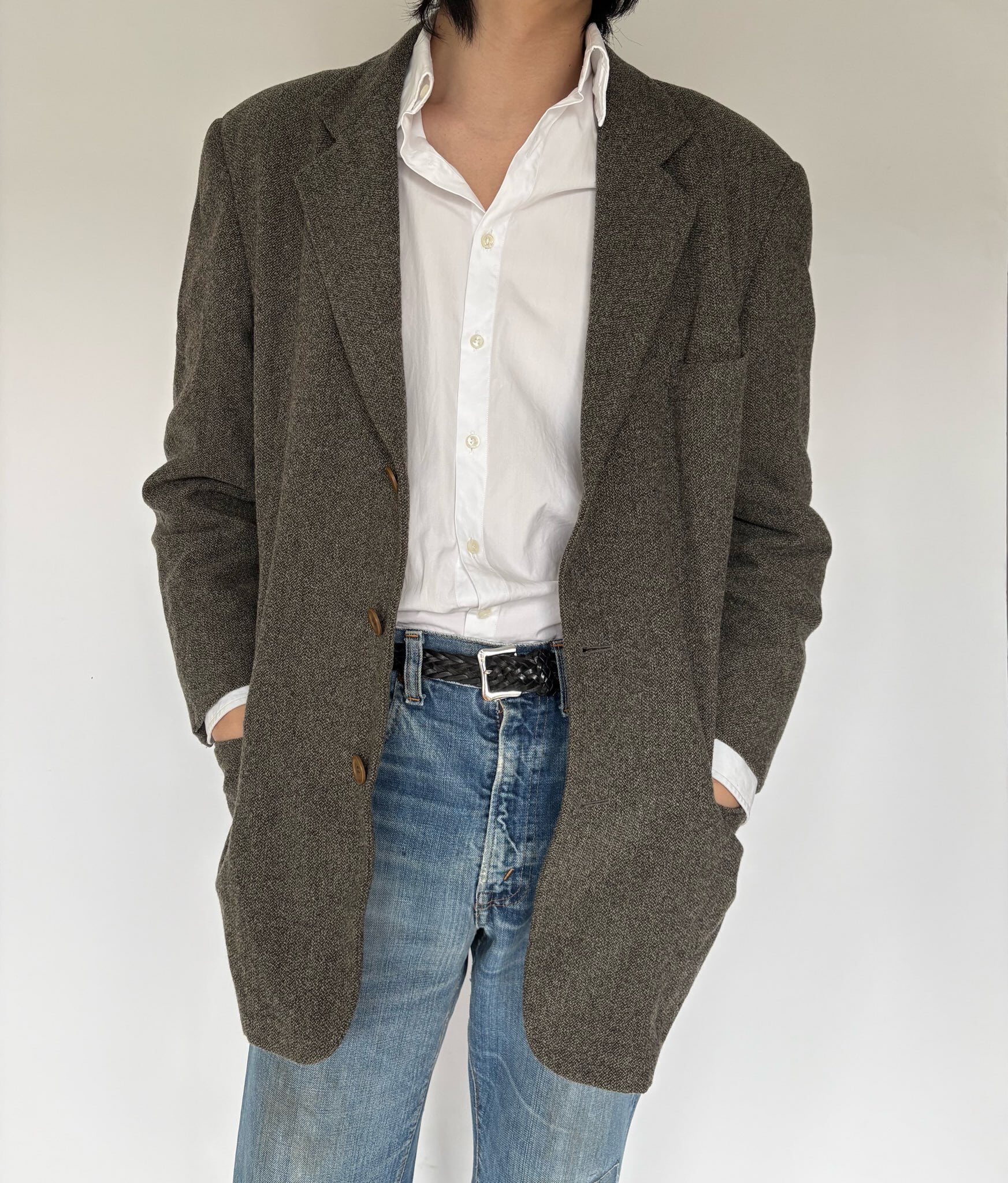 ▲Product detail 90's GIORGIO ARMANI Borgonuovo 21 / 3B Jacket / MADE IN ITALY アルマーニの中でもクラシックラインに位置する「Borgonuovo 21」 柔らかく落ちるシルエットと、構築的すぎないナチュラルな肩周りが特徴の1着です。 見た目は重厚感がありますが、背抜き仕様かつナイロン混紡のため非常に軽く、ストレスのない着心地。 真夏を除く3シーズンで着用可能です。 ボックス気味にストンと落ちるシルエットは、デニムなどと合わせたカジュアルスタイルにも相性が良く、 フォーマルとカジュアルを行き来できるバランスの良いジャケットです。 【Model】 178cm / 63kg Size 48 着用 ※写真20枚目 【素材】70% WOOL / 30% NYLON 【色】ベージュ〜ブラウンの糸にブラックが混ざるミックス生地。全体としてはグレー寄りにも見える奥行きのある色味です。 【生産国】イタリア 【状態】※裏地に極小の穴あり※背中白タグ部分にステッチ外れあり 【Borgonuovo 21】 1980年代から2000年頃にかけて、本社が所在していた場所(Via Borgonuovo 21, Milano)を冠したタグ。最高級ラインや限定製品に付けられた特別なタグとして知られています。高品質な素材と職人技が投入されたアイテム。 ▲Size Size46 肩幅 : 48.0cm バスト : 52.5cm ウエスト : 48.5cm 裾囲 : 48.5cm 着丈 : 76.0cm 袖丈 : 59.0cm →アキミセ仕様の為調整可能 ▲Condition Used.(コンディション等ご理解いただけますよう、お願いいたします。) ▲Caution ※平置き採寸になりますので若干のずれが生じる場合がございます ※USED品の為、返品・交換・クレーム等は一切お受けできません ※色合いとサイズには若干の個体差がございますので、ご了承くださいませ