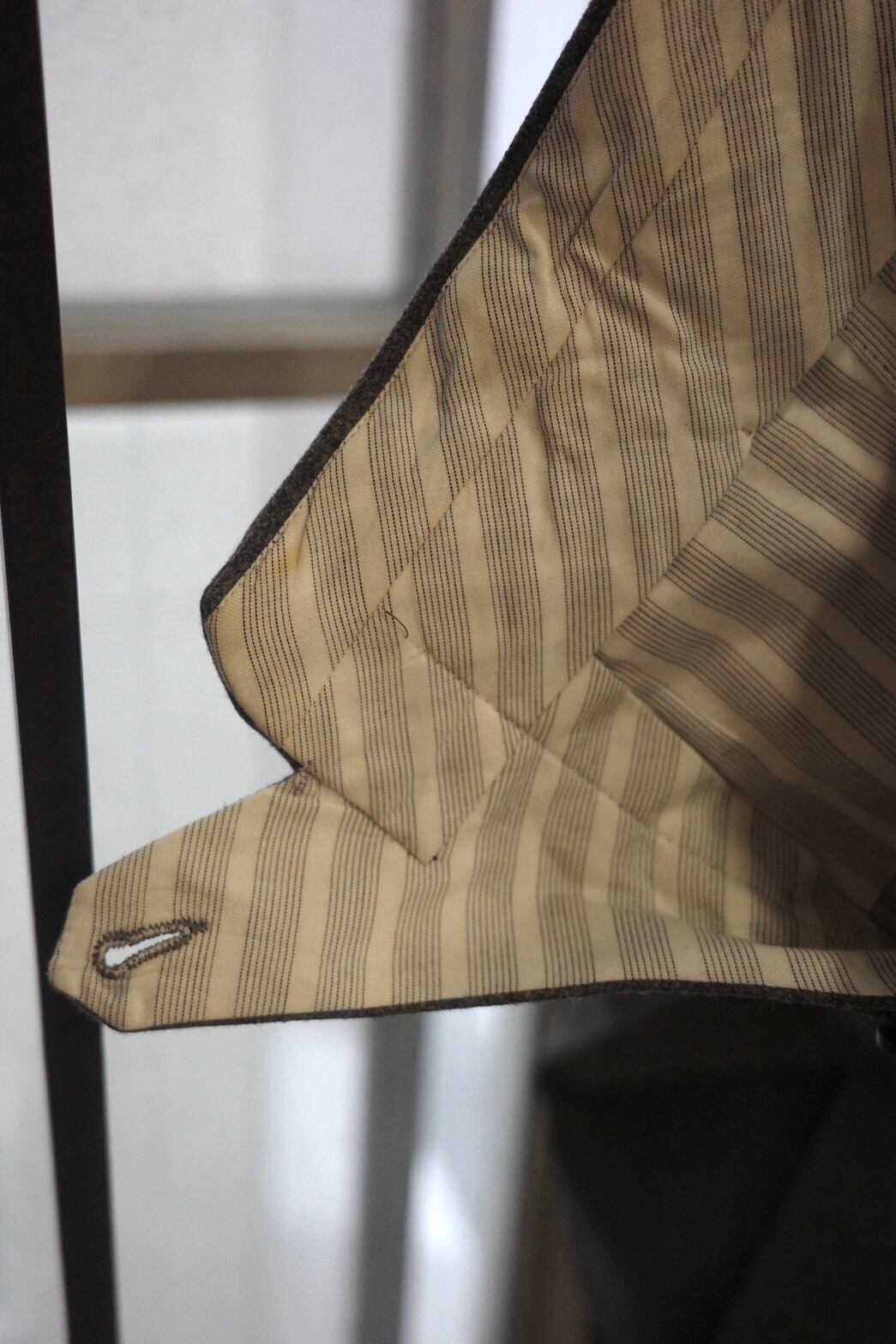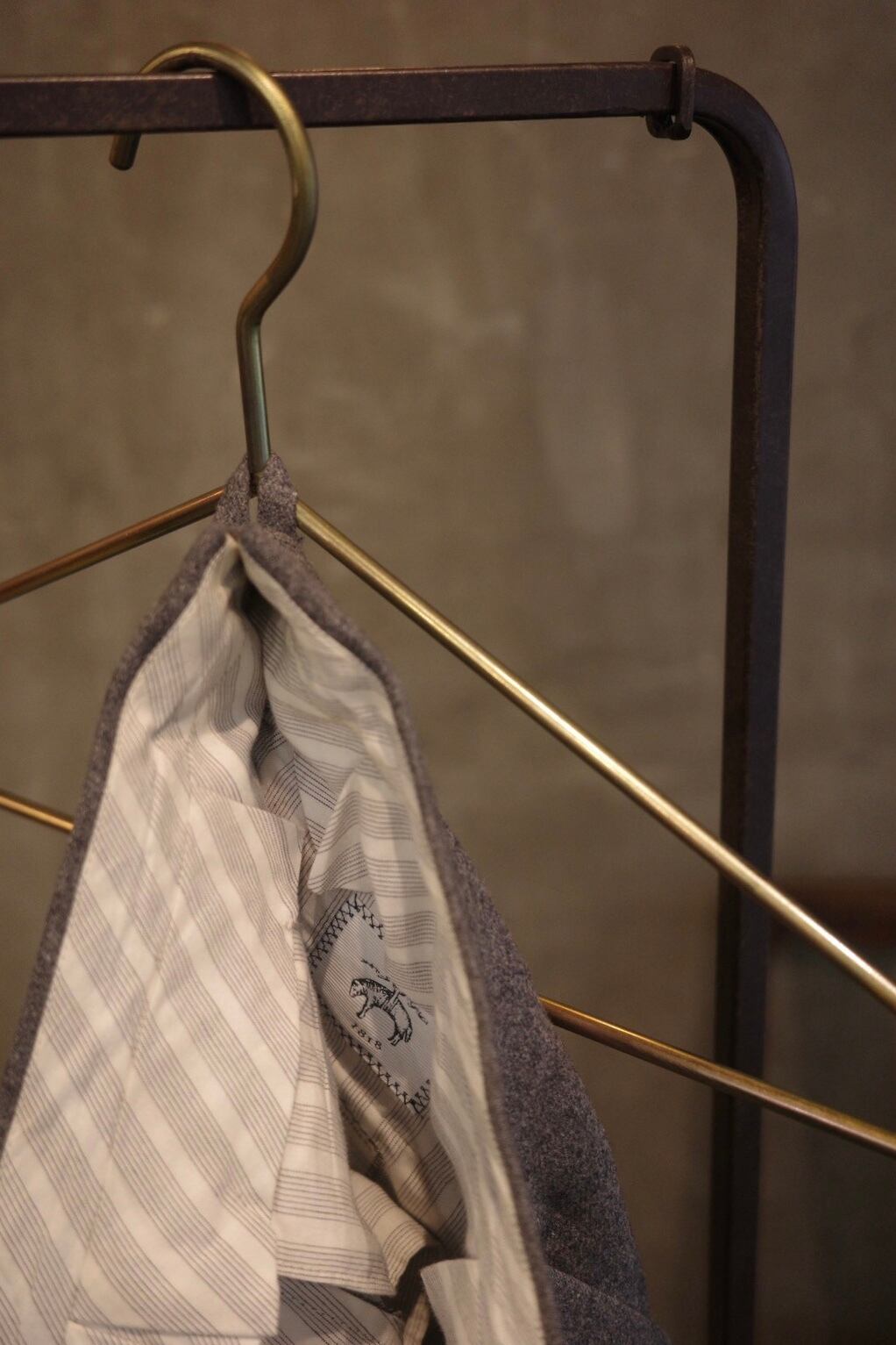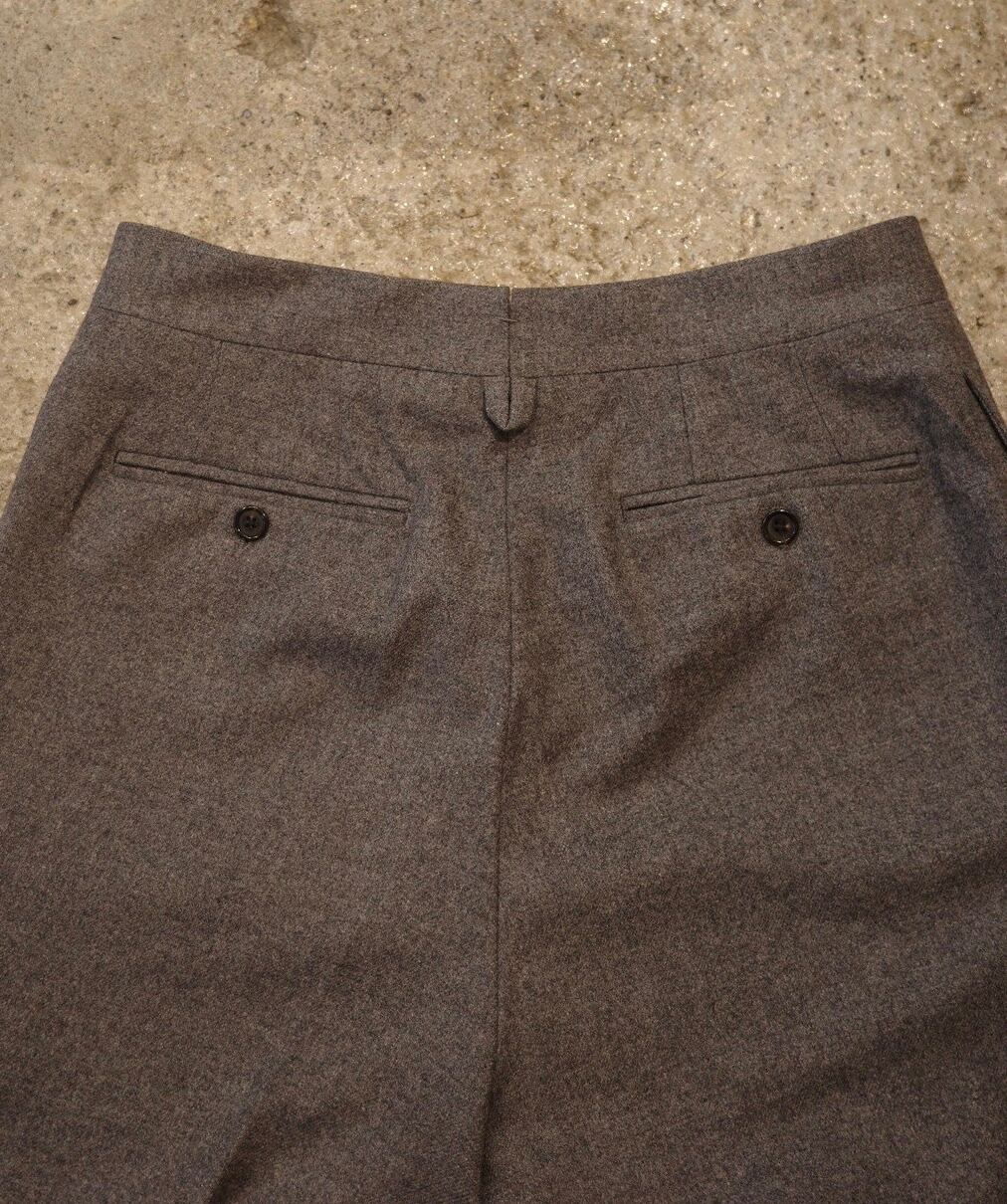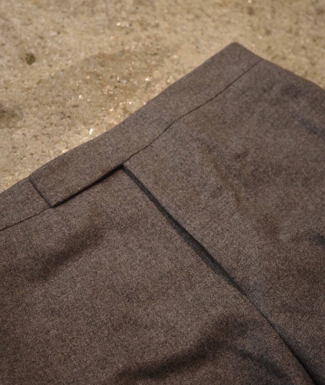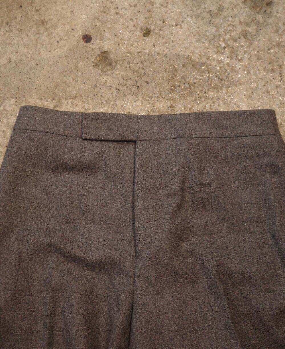 こちらの商品はトムブラウン期のモノでございます。ノープリーツ、ベルトループなし、太いダブル幅とトムブラウンらしいデザインです。無駄なモノが一つもないシンプルなスラックスで履いた時のシルエットが魅力的な一着。