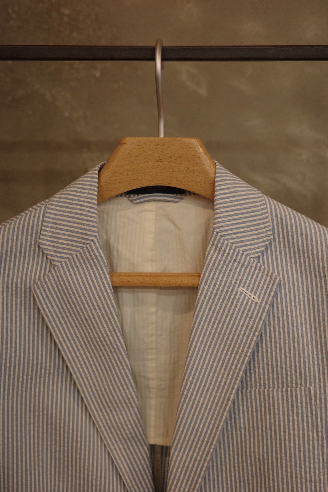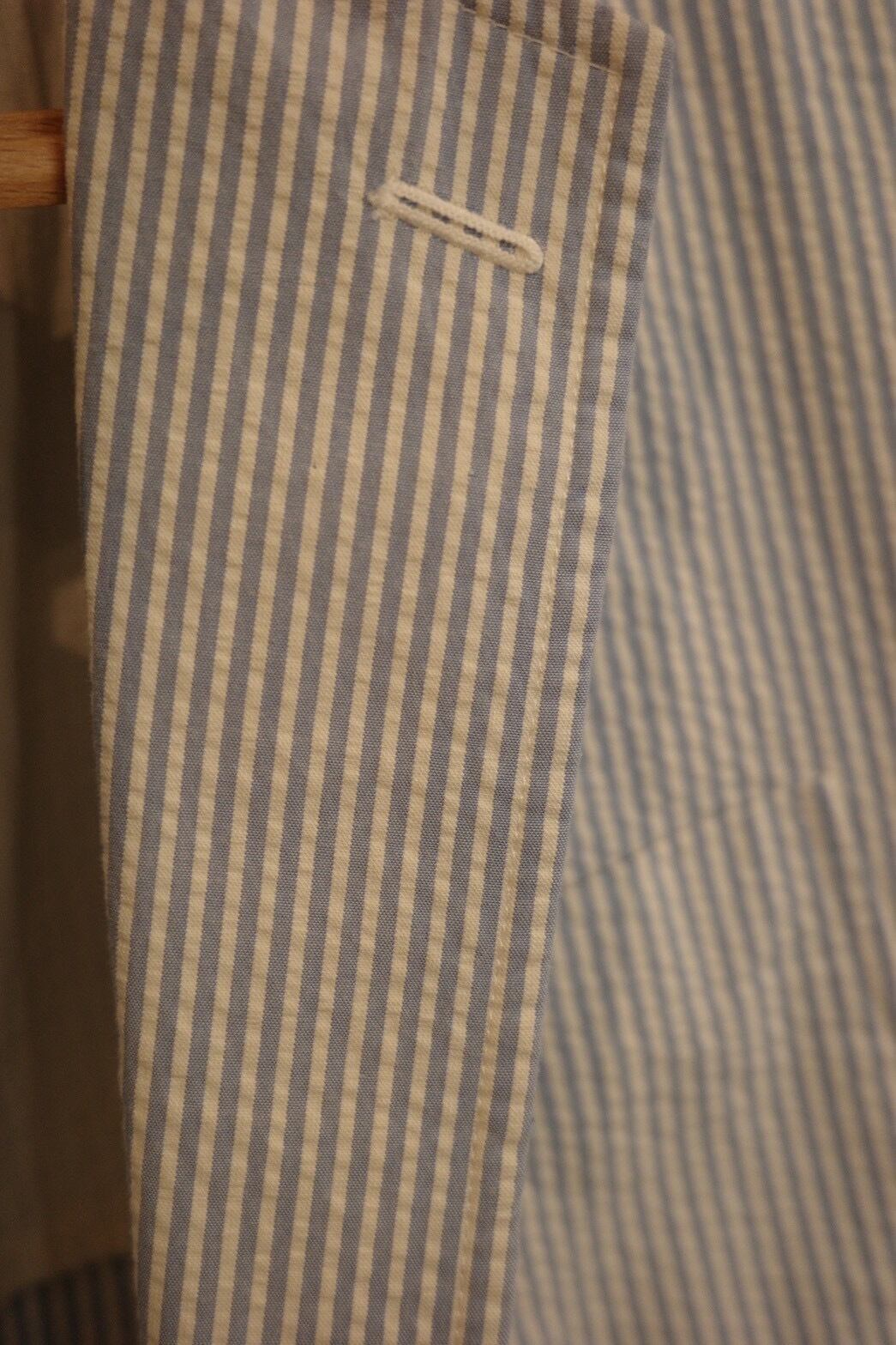 清涼感のあるコットンシアサッカー生地に、淡いブルーストライプが印象的な一着です。