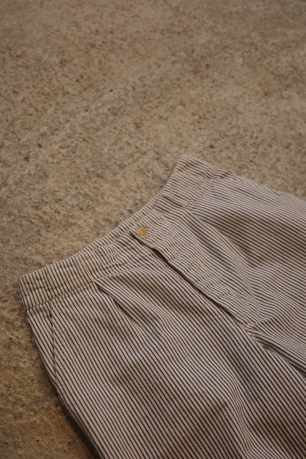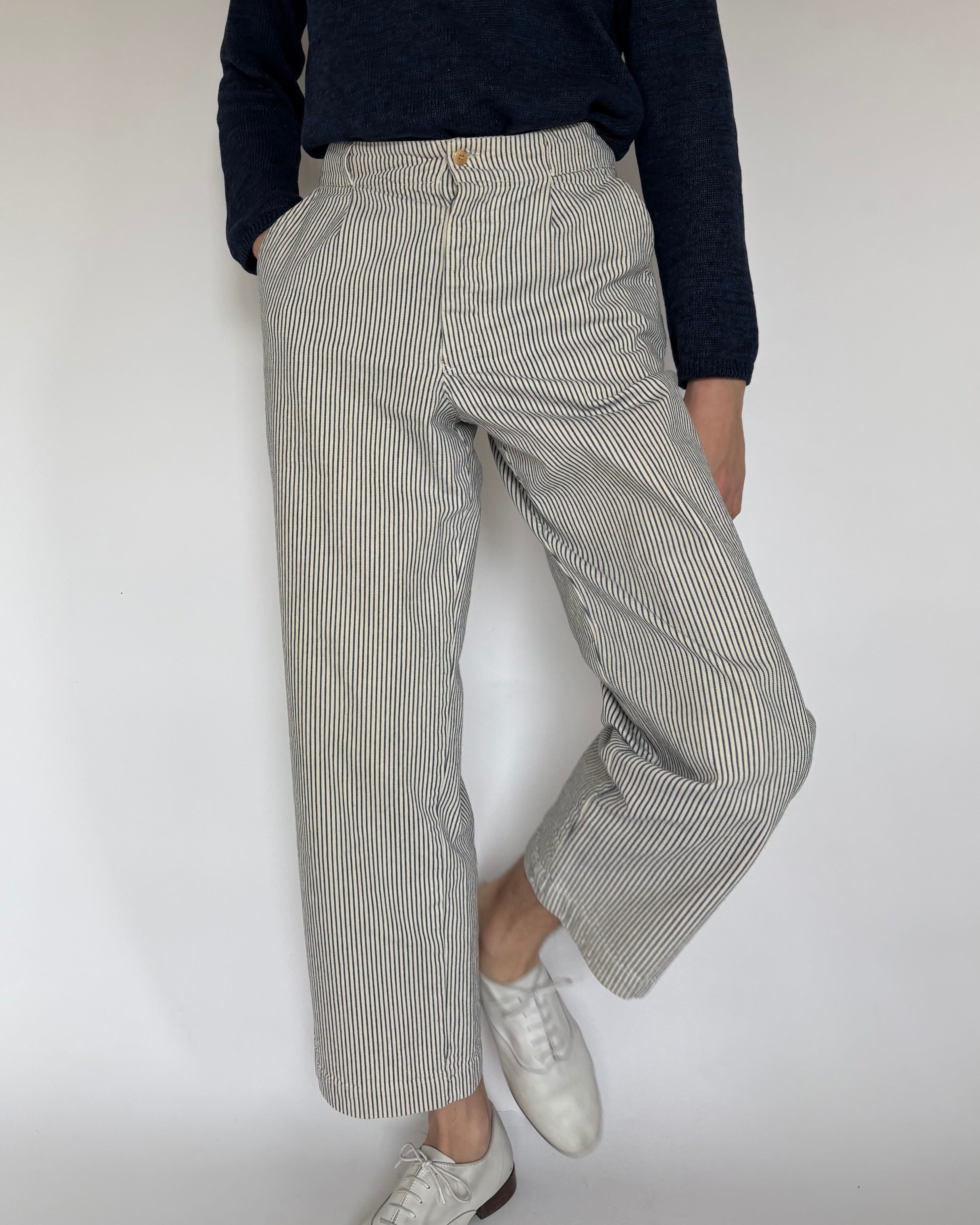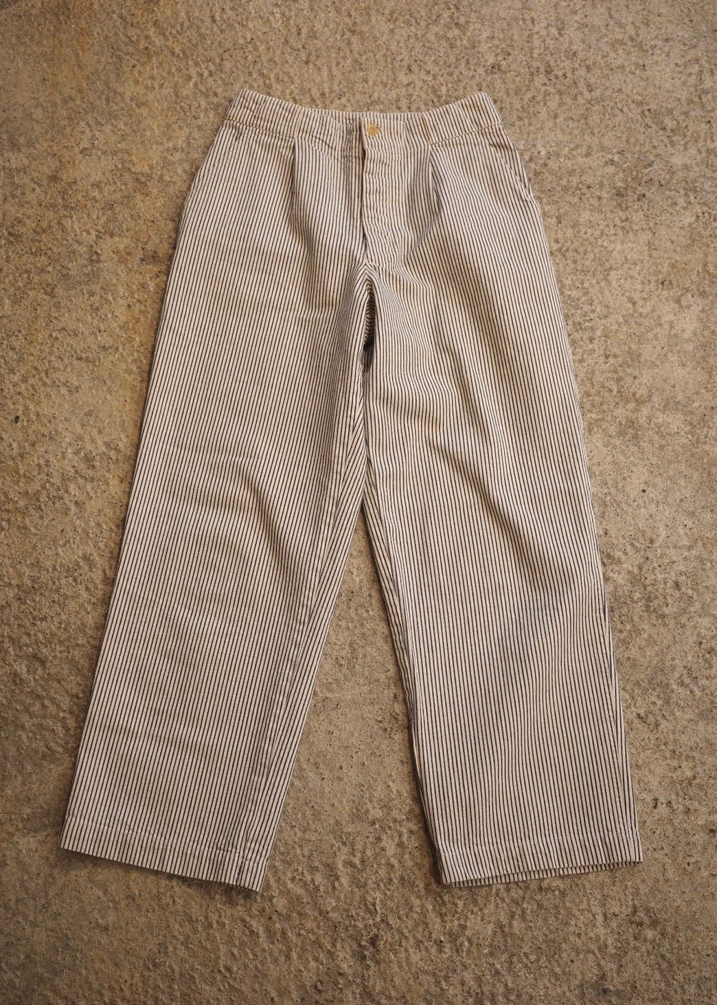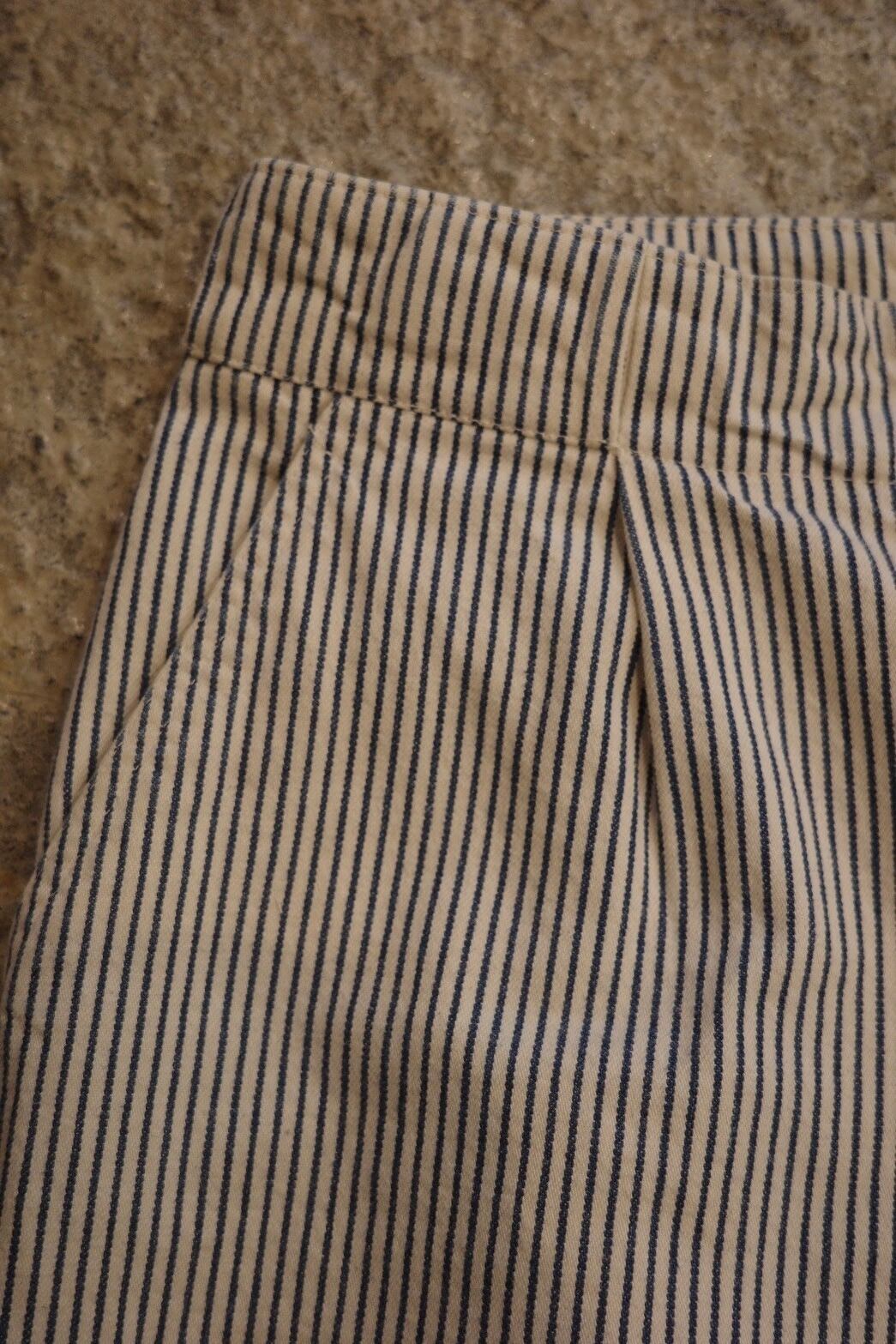 クラシックなヒッコリーストライプに、ややワイドなストレートシルエットが特徴の一本。