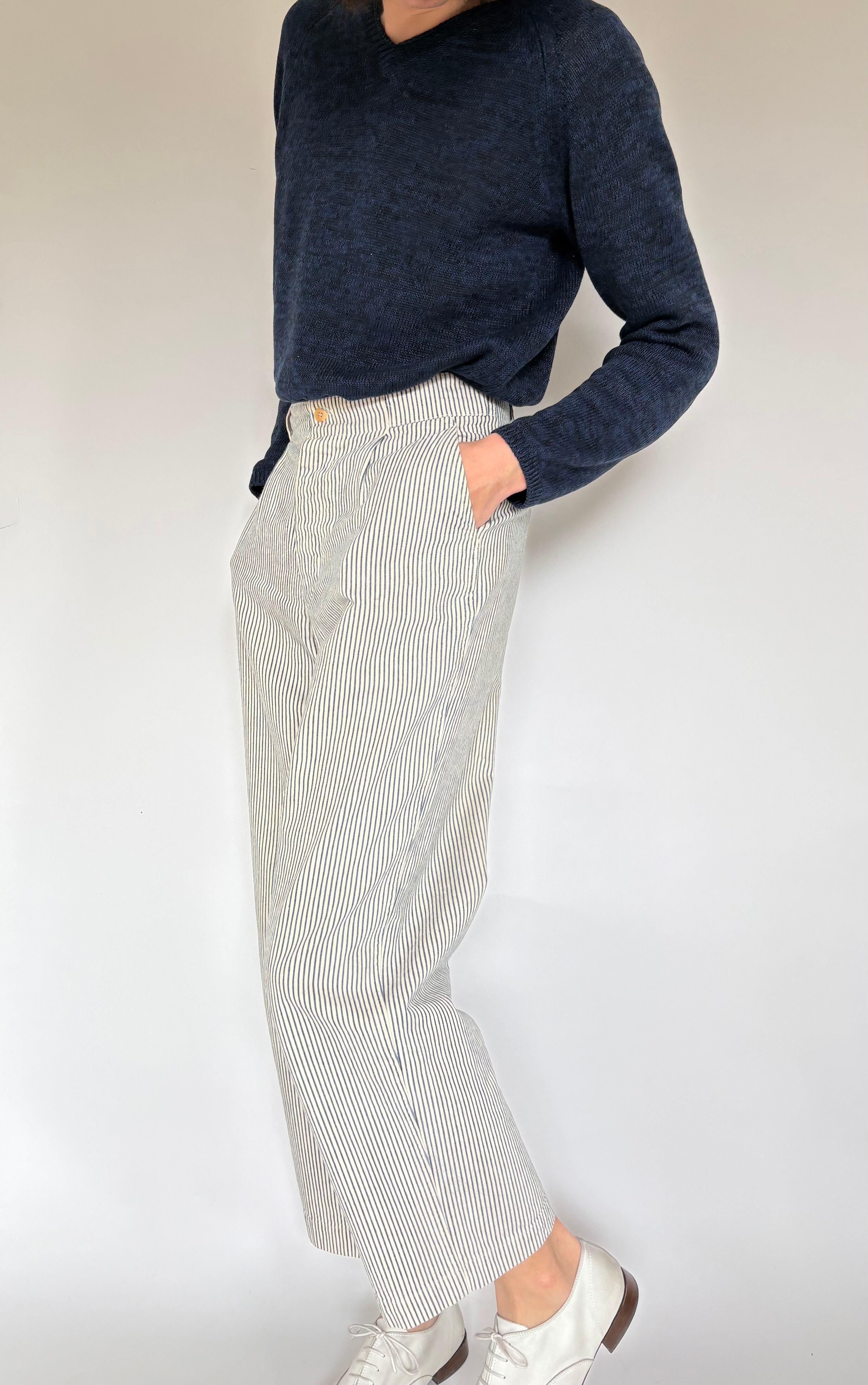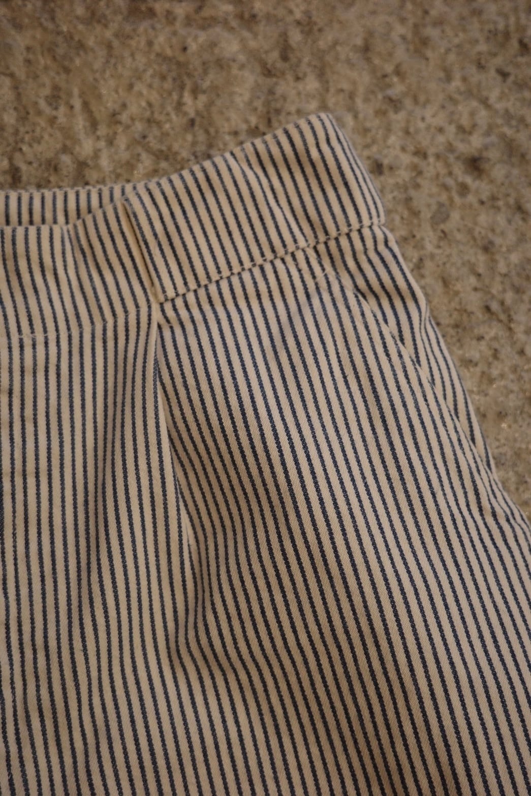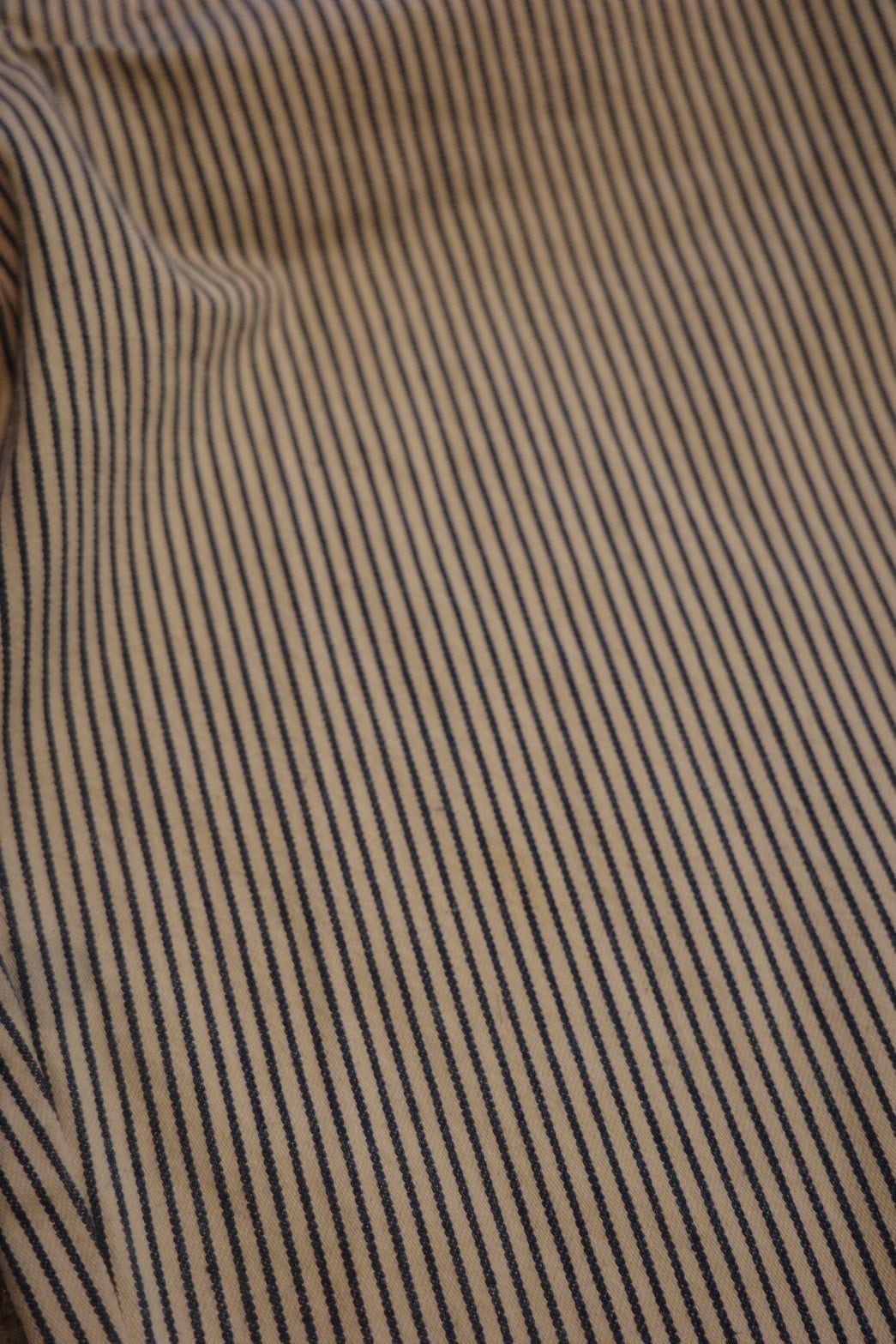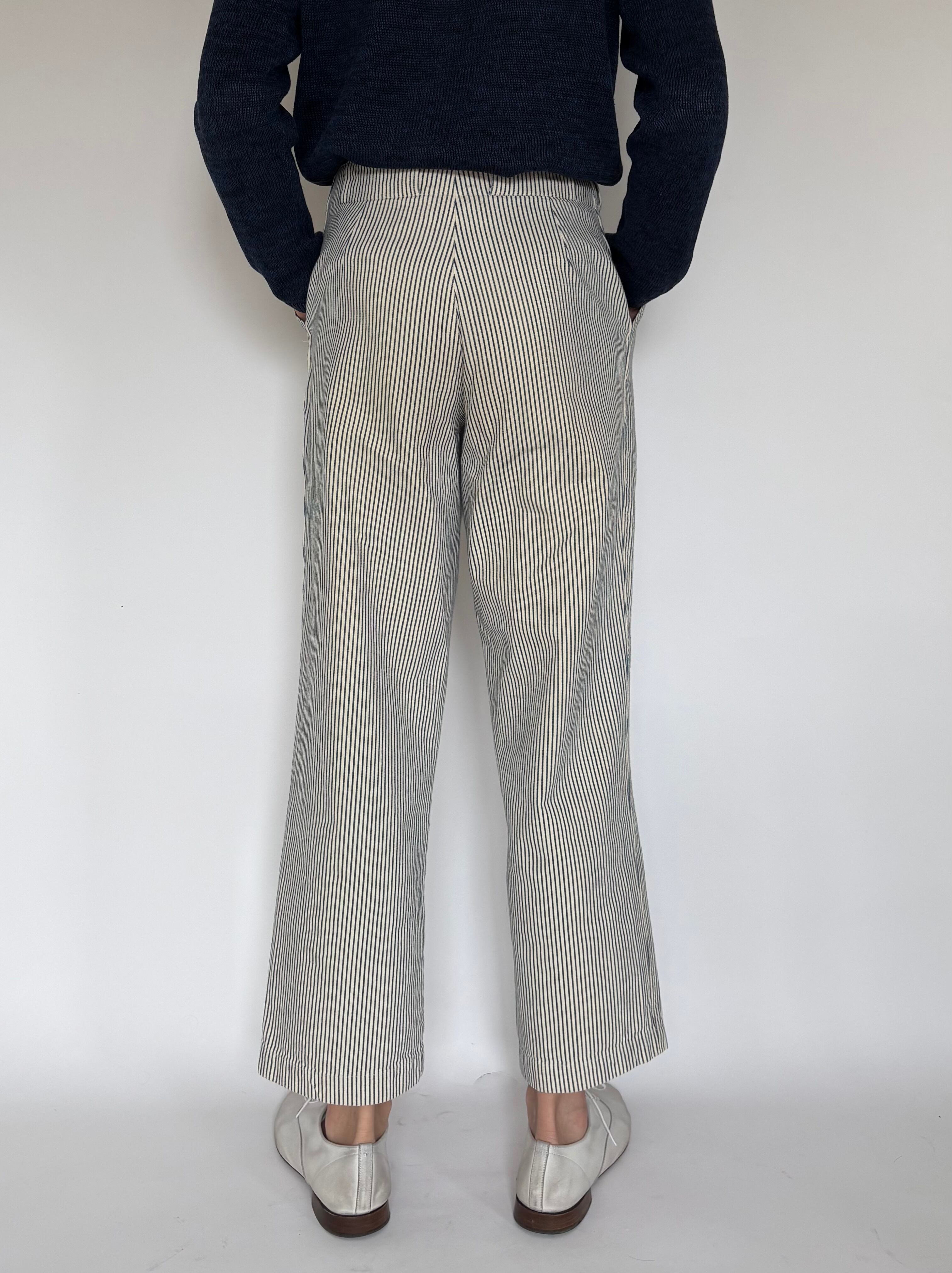 クラシックなヒッコリーストライプに、ややワイドなストレートシルエットが特徴の一本。